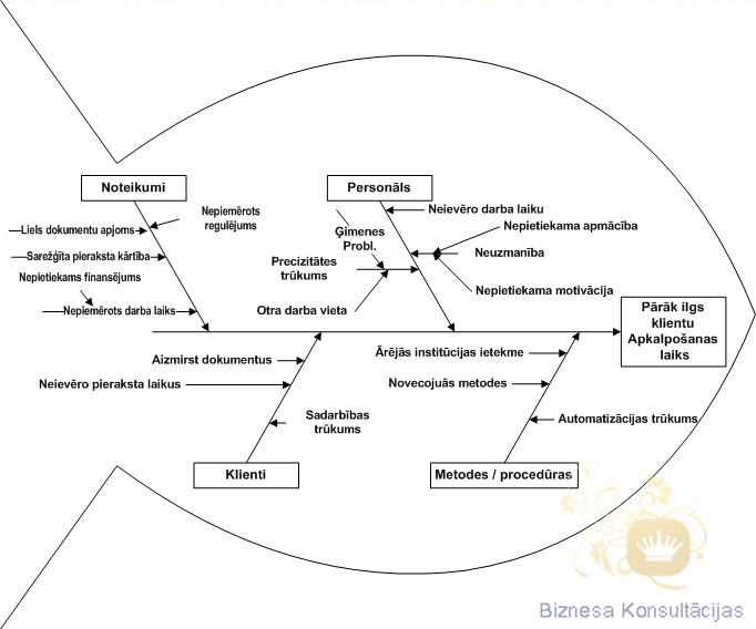 Cēloņu seku diagramma (fishbone). Tiek pielietota, lai atrastu problēmu